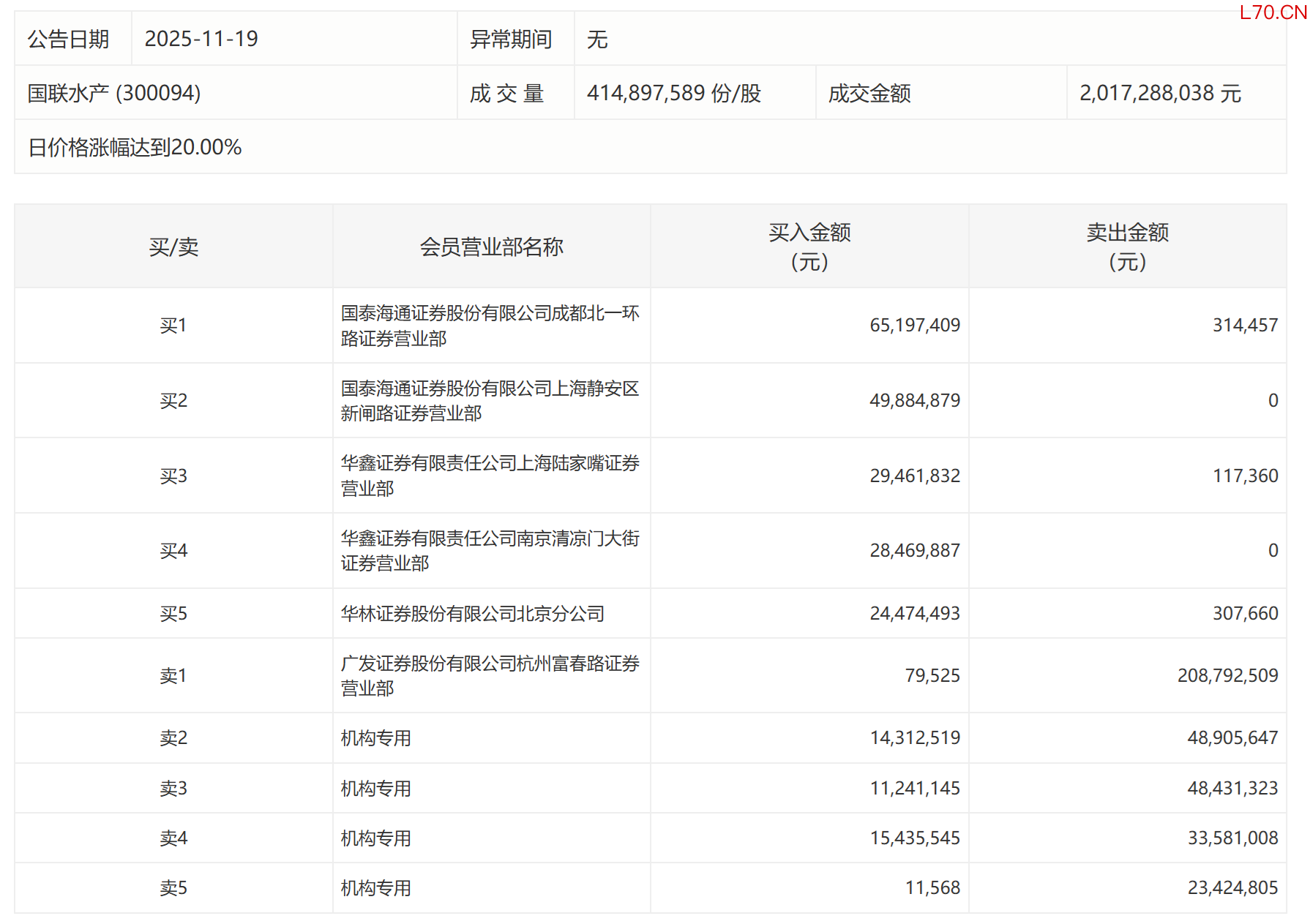 国联水产今日20%涨停,4家机构专用席位净卖出1.13亿元