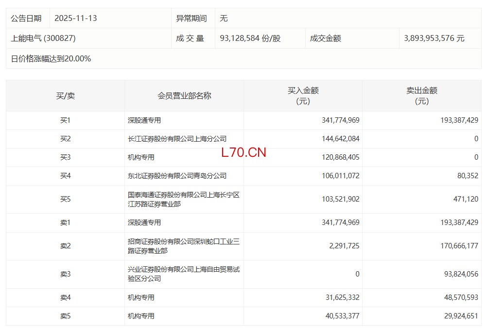 上能电气今日20cm涨停,2家机构专用席位净买入1.31亿元