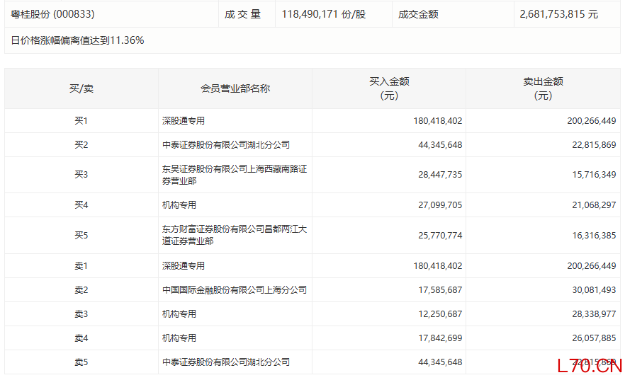 粤桂股份今日涨停 深股通席位买入1.8亿元并卖出2亿元