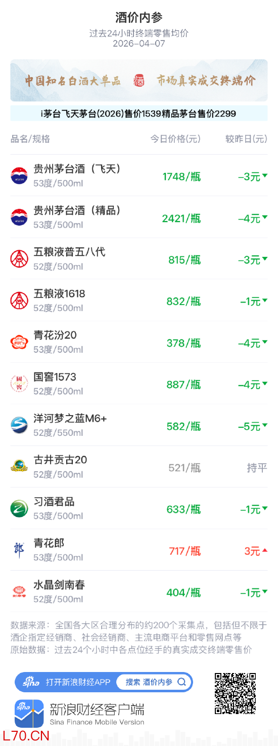 “酒价内参”每日数据源自全国各大区均有合理分布的约200个采集点,包括但不限于酒企指定经销商、社会经销商、电商平台和零售网点等,原始取样数据为过去24个小时各点位经手的真实成交终端零售价,力求为各界提供一份关于知名白酒市场价的客观、科学、全程可追溯数据。随着元旦官方i茅台平台开售1499元/瓶的飞天茅台(3月31日凌晨上调至1539元/瓶),1月9日开售2299元/瓶的精品茅台,这一新渠道对两款产品终端零售均价的磁吸式影响力逐步显现。“酒价内参”每日发布的酒价遵循对真实成交量加权的计算规则,我们已将可确量的价格引入两种酒品终端零售价的计算中。