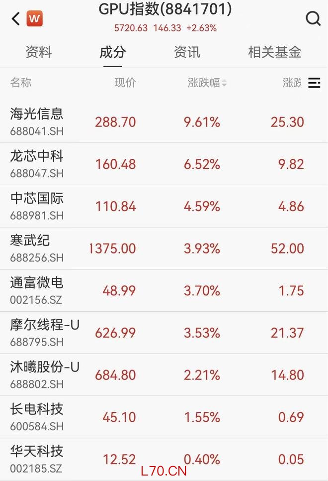 4月24日,GPU指数盘中直线拉升,截至午盘,海光信息大涨超9%、龙芯中科、中芯国际、通富微电、寒武纪、摩尔线程等个股纷纷跟涨。