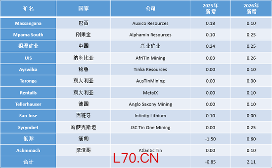 2026年全球新增锡矿投产项目增量有限、以小型、尾矿、复产、技改为主,无大型新矿集中落地。全球新增锡矿供应约2.1-2.4万吨