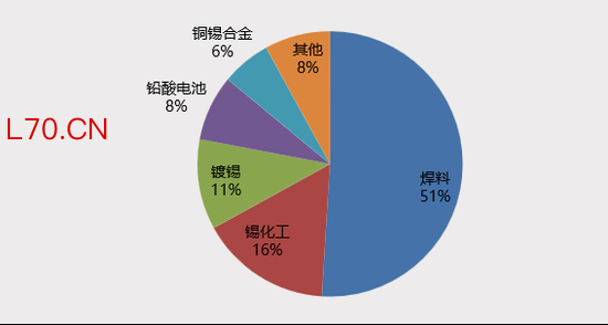 国际锡业协会(ITA)根据用途将锡下游加工产品分类,包括焊料、锡化工、镀锡板、锡铜合金、铅酸电池等,下游消费主要包括焊料、锡化工、马口铁(镀锡板)等。其中,焊料占比高达51%,其次是锡化工和马口铁,分别占比16%、11%,铅酸电池、锡合金占比8%、6%。
