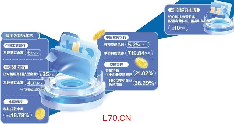 国有大型商业银行表现如何?年报显示,截至2025年末,中国工商银行的科技贷款余额已达到6万亿元;中国农业银行已对接服务科技型企业超35万家,科技贷款余额4.7万亿元,年增速超过20%;中国银行率先发布支持人工智能产业链发展行动方案,科技贷款余额增长18.78%;中国建设银行科技贷款余额5.25万亿元,承销科创债券719.84亿元,累计设立28只金融资产投资公司(AIC)股权投资试点基金;交通银行专精特新中小企业贷款、科技型中小企业贷款增速分别高达21.02%和36.29%;中国邮政储蓄银行设立科技专营机构、配置专业队伍,服务科技企业超10万户。